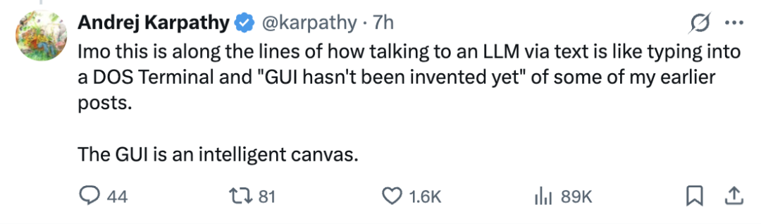 在卡帕西看来,现在用文本和大模型对话,就像在敲DOS命令行,图形界面(GUI)还没被发明出来一样,而“智能画布”这种可视化、可直接操作的交互方式,才是大模型未来该有的GUI。