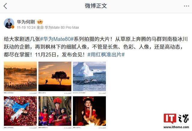 值得一提的是,华为终端 BG 首席执行官何刚在 11 月 19 日还公布了华为 Mate 80 系列拍摄样张,称新机“不管是长焦、色彩、人像,还是高动态,都尽在掌握”。