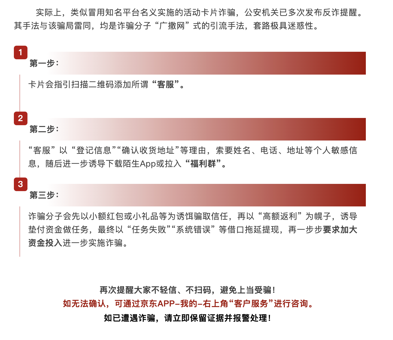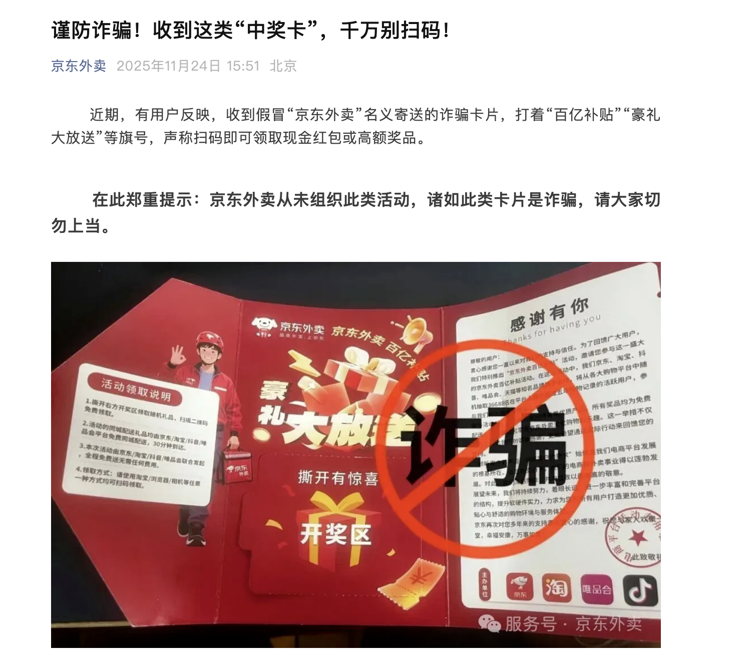 京东外卖:收到这类“中奖卡”,千万别扫码 凤凰网科技讯 11月24日,京东外卖官方发文称,近期有用户反映,收到假冒“京东外卖”名义寄送的诈骗卡片,打着“百亿补贴”“豪礼大放送”等旗号,声称扫码即可领取现金红包或高额奖品。官方郑重提示:京东外卖从未组织此类活动,诸如此类卡片是诈骗,请大家切勿上当。 Published by 风君子 独自遨游何稽首 揭天掀地慰生平 View all posts by 风君子