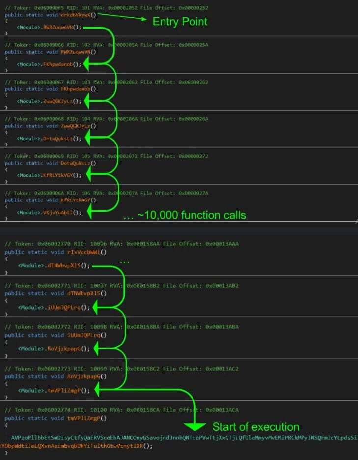 为了躲避安全软件的分析,攻击者还使用了一种名为“ctrampoline”的动态规避技术,即在程序入口点调用上万个空函数,干扰逆向工程分析。