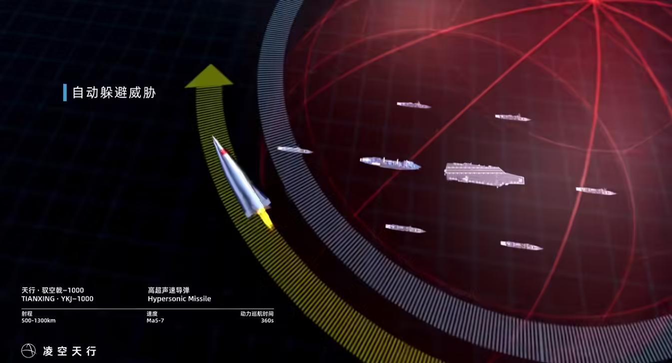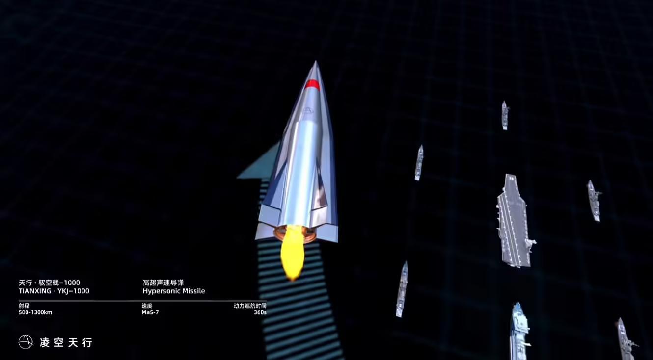 官方介绍视频显示,驭空戟-1000 高超声速导弹支持 500-1300 公里射程、5-7 马赫飞行速度及 360 秒动力巡航时间。