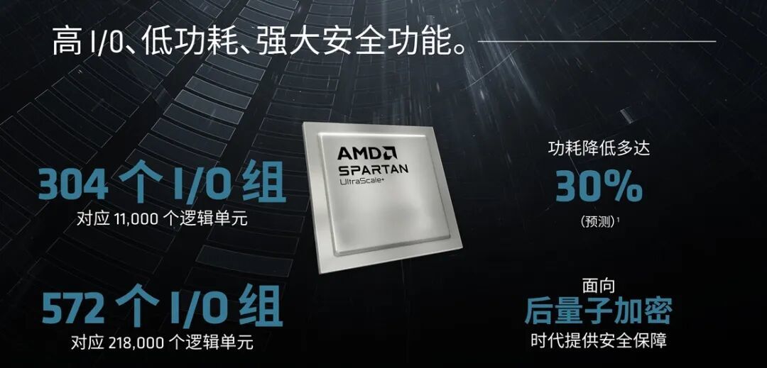这一产品组合中的最新产品就是AMD Spartan UltraScale+ FPGA,其专门为降低功耗、成本、保持高性能而设计,且还会提供灵活的I/O、PCIe接口、集成内存和系统监控。同时,AMD还提供了不同的架构,使企业能够根据不同的应用场景在尺寸、功能之间灵活选择。