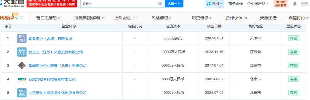 天眼查信息显示,截至目前,俞敏洪在都会洪业(天津)有限公司、新东方(江苏)文旅投资有限公司、敏闻洪业企业管理(北京)有限公司等14家存续企业中担任法定代表人。
