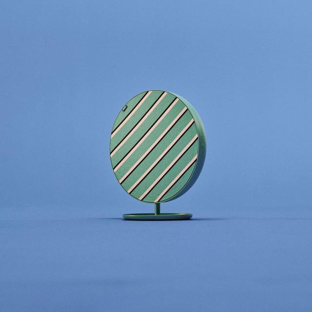 一款中等尺寸的音箱,采用绿色、棕色和米色的斜条纹设计。这两款音箱均配备底座,既可以独立放置,也能悬挂使用。