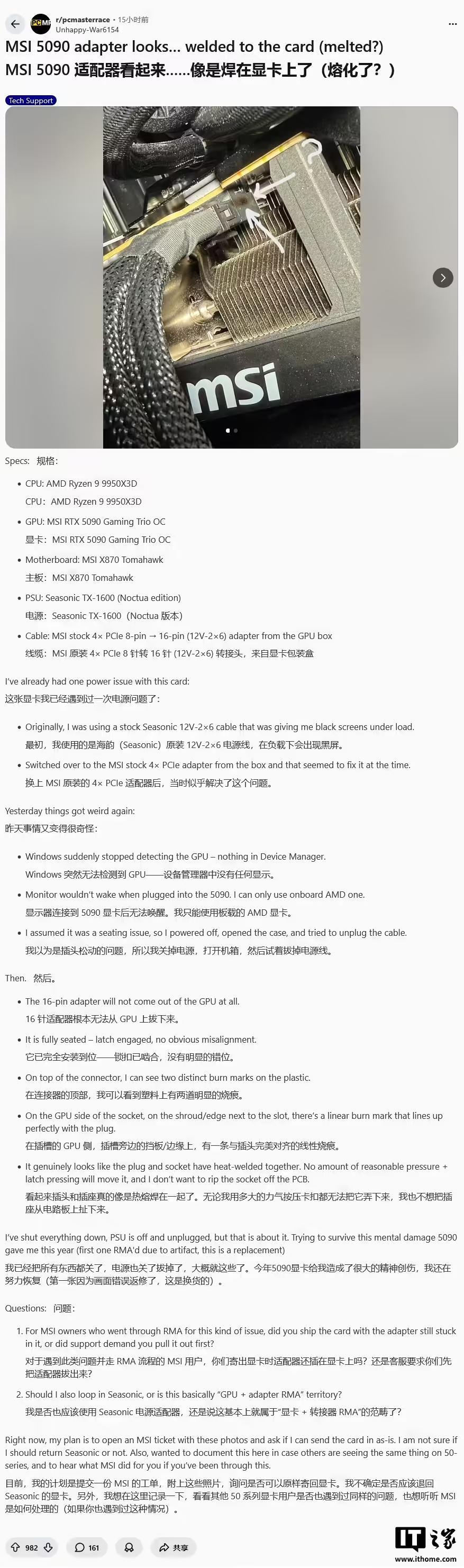 网友 Unhappy-War6154 昨日在 Reddit 社区发帖,称在正常负载情况下,其电脑突然无法检测到显卡。他经过检查,发现所使用的微星(MSI)GeForce RTX 5090 显卡的电源适配器出现了烧灼痕迹。