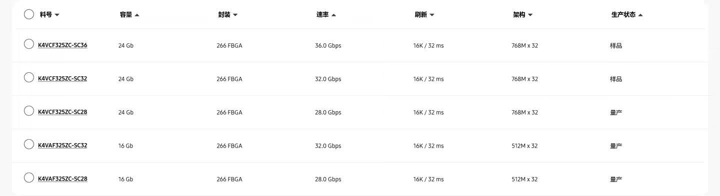 IT之家 11 月 26 日消息,根据三星半导体官网公布的 GDDR7 显存产品规格,三星电子现已出样 36Gbps 与 32Gbps 速率的 24Gb (3GB) GDDR7,相较已量产的 28Gbps GDDR7 性能进一步提升。