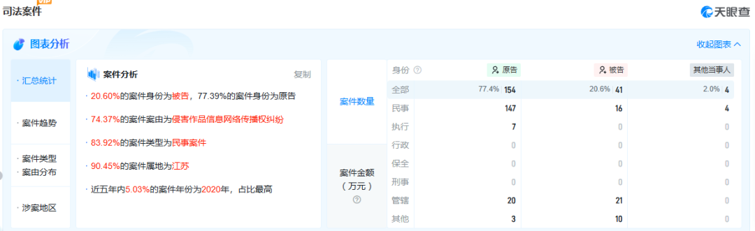 雷达财经注意到,截至目前,视觉中国在天眼查上共有司法案件199条,其中作为原告154条,且74.37%的案件案由为侵害作品信息网络传播权纠纷。
