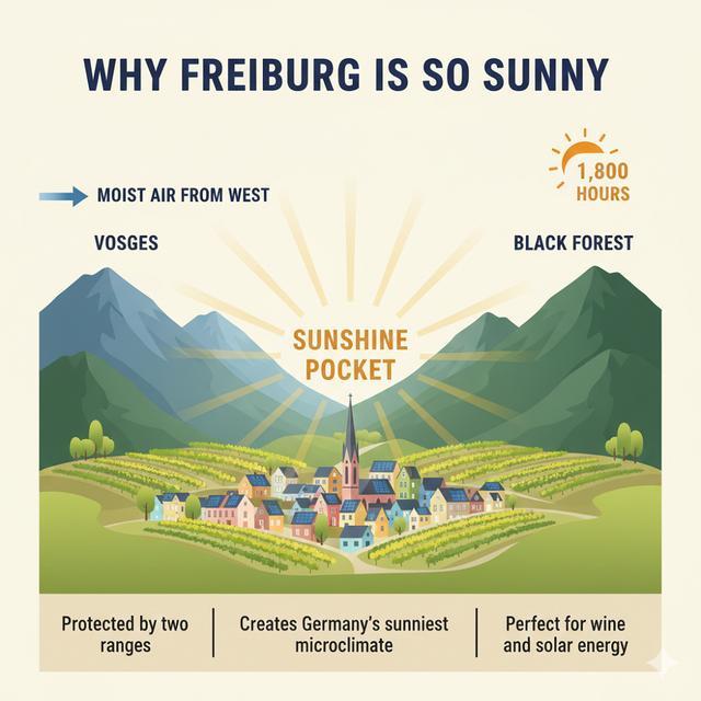为考察两款模型的实用性,我们试着让它们打造了一张科普用途的简易插图,解释德国城市弗赖堡的阳光为何如此充足。图中的所有文字都是提示词提供的,但画面内容主要由模型自行发挥。