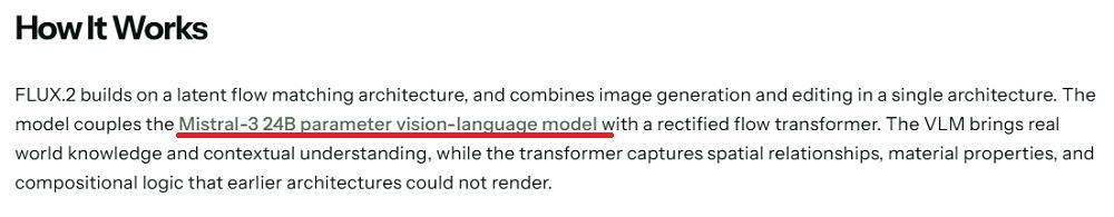 FLUX.2基于潜在流匹配架构,将图像生成和编辑集成在单一架构中。该模型将欧洲本土AI创企Mistral自研的Mistral-3 24B视觉语言模型(VLM)与整流流式(Rectified Flow)Transformer结合。VLM带来了现实世界的知识和上下文理解,而Transformer则捕捉了早期架构无法实现的空间关系、材料属性和组合逻辑。