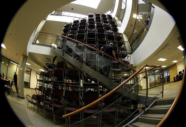 原文:Office building stairwell cam, chairs stacked impossibly high reaching multiple floors, person climbing past them on stairs, emergency lighting, fisheye distortion, architectural wrongness.