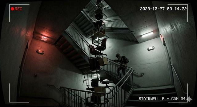 翻译:办公楼楼梯间的监控画面:成堆的椅子被不可能地垒到数层楼高,有个人正从楼梯上经过这些椅子旁,场景中带有应急照明、鱼眼镜头畸变,以及明显违背建筑结构逻辑的异常感。