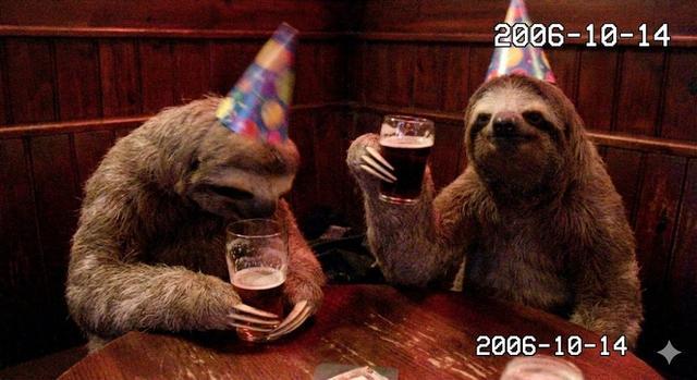 我们还尝试让两款模型生成了2000年代CCD相机风格的照片,画面内容是两只树懒在酒馆喝酒。