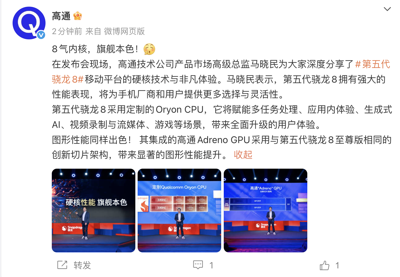 高通技术公司产品市场高级总监马晓民在发布会现场介绍,第五代骁龙8采用定制的Oryon CPU,它将赋能多任务处理、应用内体验、生成式AI、视频录制与流媒体、游戏等场景,带来全面升级的用户体验。
