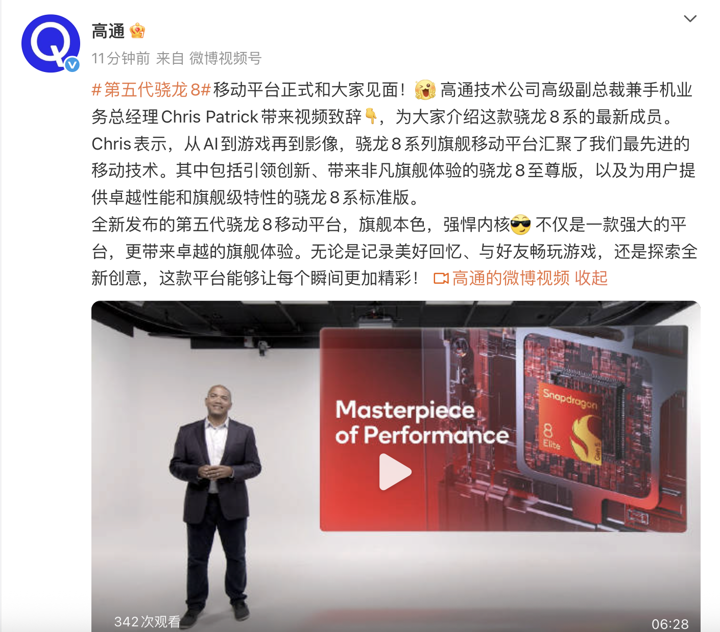 凤凰网科技讯 11月26日,高通技术公司今日宣布推出第五代骁龙8移动平台。高通技术公司高级副总裁兼手机业务总经理Chris Patrick介绍,该平台分为至尊版和标准版,能够满足用户对于前沿功能日益增长的需求,涵盖AI、影像创新以及沉浸式游戏体验等。