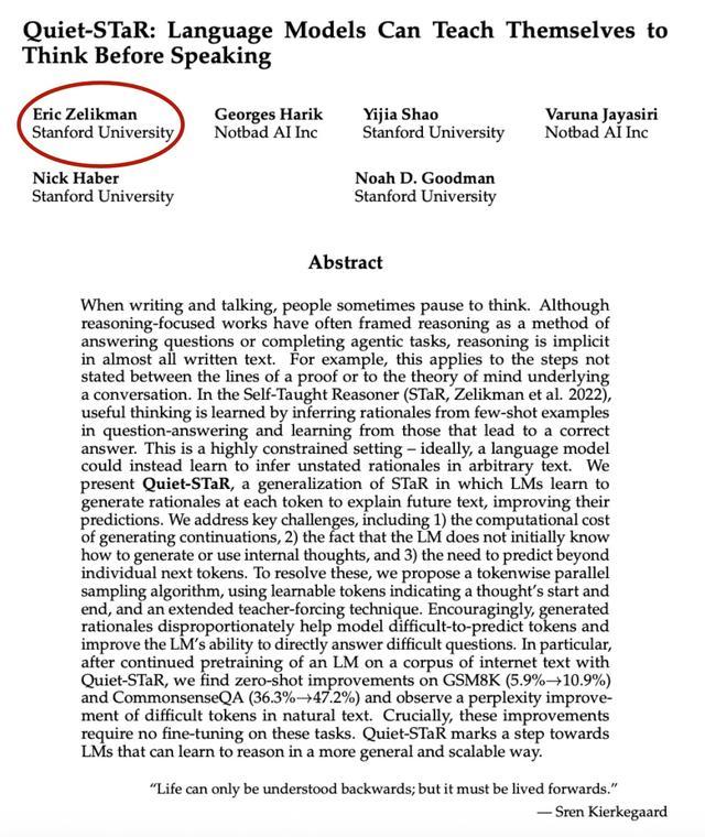 在xAI工作期间,他还开创性地提出了STaR算法,其最为人熟知的成就是与人合著了Quiet-STaR—— 这是一种能让语言模型在生成输出前先产生内部推理过程的方法,该方法让模型在常识问答(CommonsenseQA)和GSM8K等任务中带来了显著的性能提升。