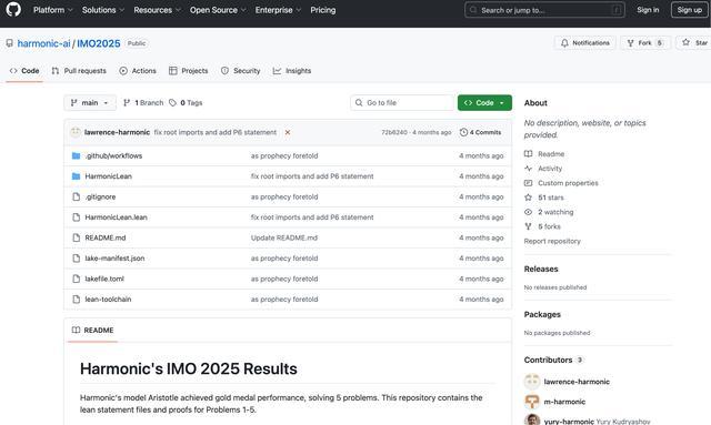 今年7月,Harmonic在社交平台X上官宣称,Aristotle模型在国际数学奥林匹克竞赛(IMO)中取得了金牌级别的成绩,成为首个在该比赛中,对六道题中的五道题给出可被形式化验证解答的模型,相关证明公开发布在了Github上。