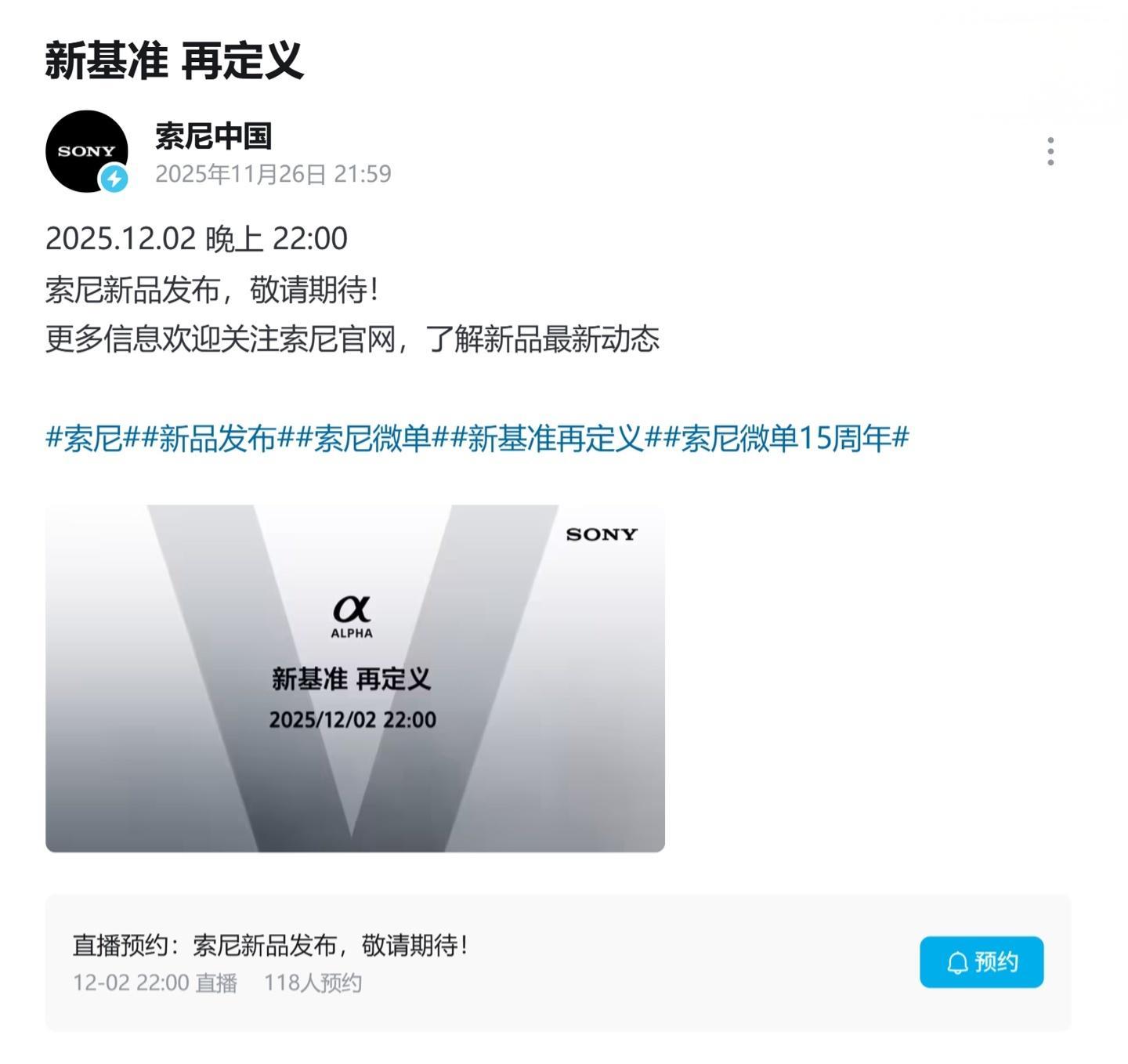 IT之家 11 月 26 日消息,索尼中国今天在B站宣布 α 新品发布会定档 12 月 2 日晚上 22 点整,有望推出 Alpha 7 V 全画幅无反相机等新品。