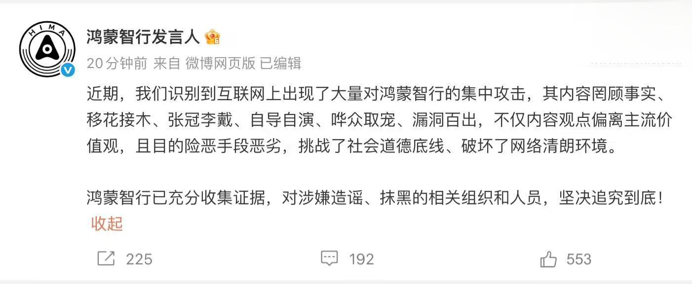 面对此类针对性的舆论攻势,鸿蒙智行方面表现出强硬态度。公告明确强调,目前官方已完成了相关证据的充分收集工作,将对涉嫌造谣、抹黑的特定组织及个人坚决追究到底,意在通过法律手段维护品牌权益及社会公德底线。