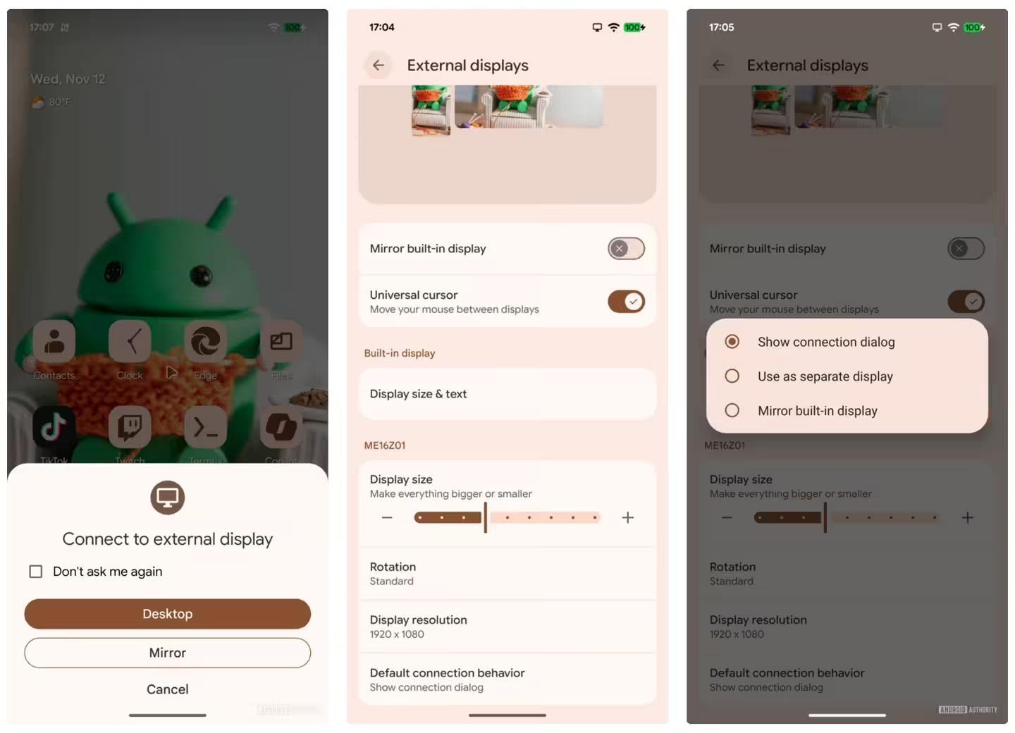 而在未来安卓更新中,谷歌计划引入全新的连接对话框。当用户将手机连接到外部显示器后,系统会自动弹出提示,提供“桌面模式”和“屏幕镜像”两个选项。