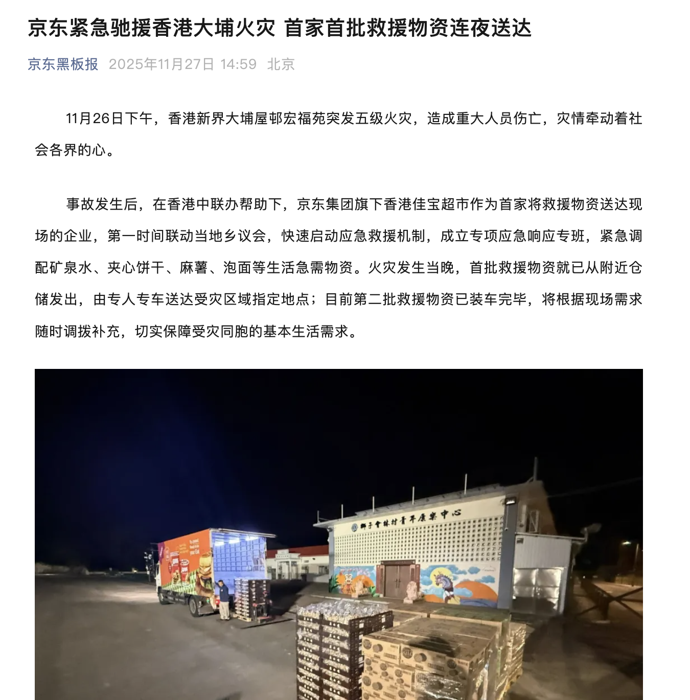 凤凰网科技讯 11月27日,据“京东黑板报”消息:11月26日下午,香港新界大埔屋邨宏福苑突发五级火灾,造成重大人员伤亡,灾情牵动着社会各界的心。