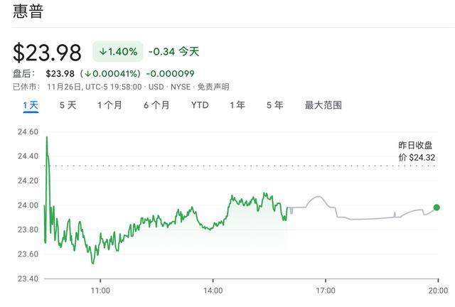 受该消息影响,惠普公司股价25日当天盘后下跌超过5%,截至11月26日收盘,惠普公司股价为每股23.98美元(约合人民币169.79元),最新市值为224.69亿美元(约合人民币1590.89亿元)。