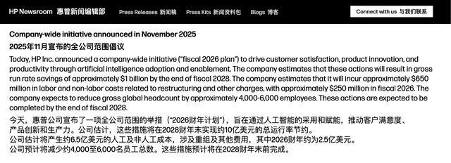 截至去年10月,惠普员工总数为5.8万人,这意味着本次裁员幅度最高可超10%。本次裁员将产生约6.5亿美元(约合人民币46.02亿元)的重组费用,其中约2.5亿美元(约合人民币17.7亿元)计入2026财年。