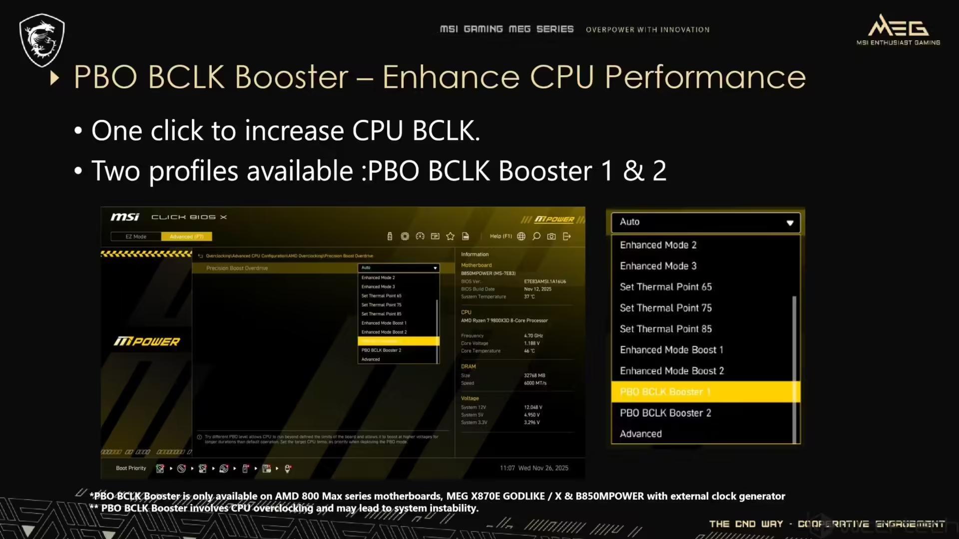 随着搭载外部时钟发生器(BCLK Generator)的全新“MAX”系列主板上市,微星进一步挖掘硬件潜力,引入了“PBO BCLK Booster”功能。该技术不仅支持最新的 MAX 系列,还向下兼容 B850MPOWER 及顶级的 MEG X870E GODLIKE 等主板。