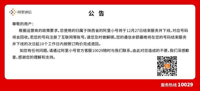 【阿里通信】尊敬的用户,您好。根据运营商的政策要求,您使用的归属于陕西省的阿里小号将于 12 月 27 日结束服务并下线,对应号码将会回收。若您的号码注册了互联网等账号,请您及时做解绑。您的通信余额最晚将在您的号码结束服务并下线的次日起 10 个工作日内按照订购价完成退回。如您有任何问题,请通过阿里小号官方客服 10029 随时与我们联系。由此对您造成的不便,我们深感歉意,感谢您的理解和支持。