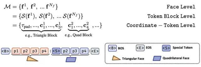 为兼容三角网格与四边网格结构,PolyGen1.5引入统一混合序列化表征,将每个Mesh拆分为面片、顶点与坐标三层token结构,并以特殊token作为占位实现三边、四边统一表达,从而使模型不再为特定拓扑设计,而是根据形状结构自适应选择面片类型,实现更好的布线效果。