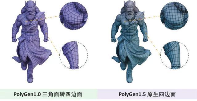 左为PolyGen 1.1的拓扑效果,右为PolyGen 1.5的拓扑效果。