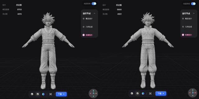 此外,PolyGen1.5新增四边面占比(quad-dominance)参数,用于控制四边面比例,创作者可通过提升该参数获得更规整的四边布线模型,也可在低面片、高硬边需求的场景中保持三边结构,生成效果从“模型给什么就用什么”演变为“创作者直接控制拓扑”。