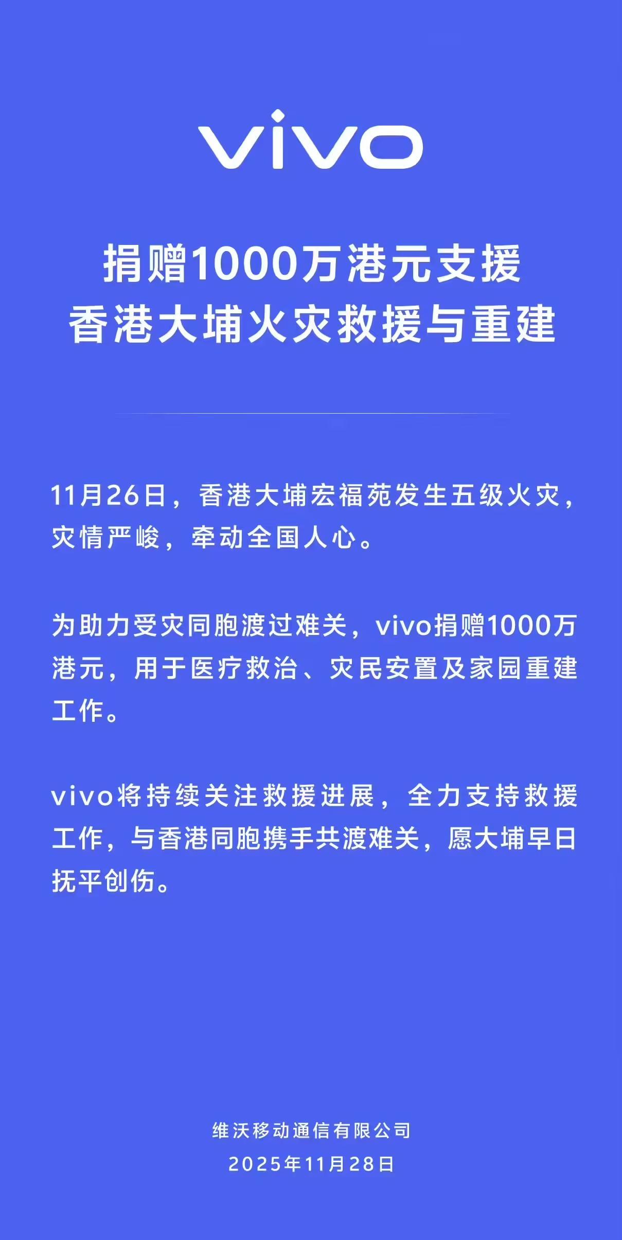 vivo捐赠1000万港元支援香港大埔火灾救援与重建 凤凰网科技讯 11月28日,近日,香港大埔宏福苑发生五级火灾。为助力受灾同胞渡过难关,vivo捐赠1000万港元,用于医疗救治、灾民安置及家园重建工作。 vivo称,将持续关注救援进展,全力支持救援工作,与香港同胞携手共渡难关,愿大埔早日抚平创伤。 香港特区政府28日下午举行发布会,介绍大埔宏福苑火灾最新情况和搜救进展。特区政府保安局局长邓炳强介绍,火灾目前已造成128人遇难。 Published by 风君子 独自遨游何稽首 揭天掀地慰生平 View all posts by 风君子