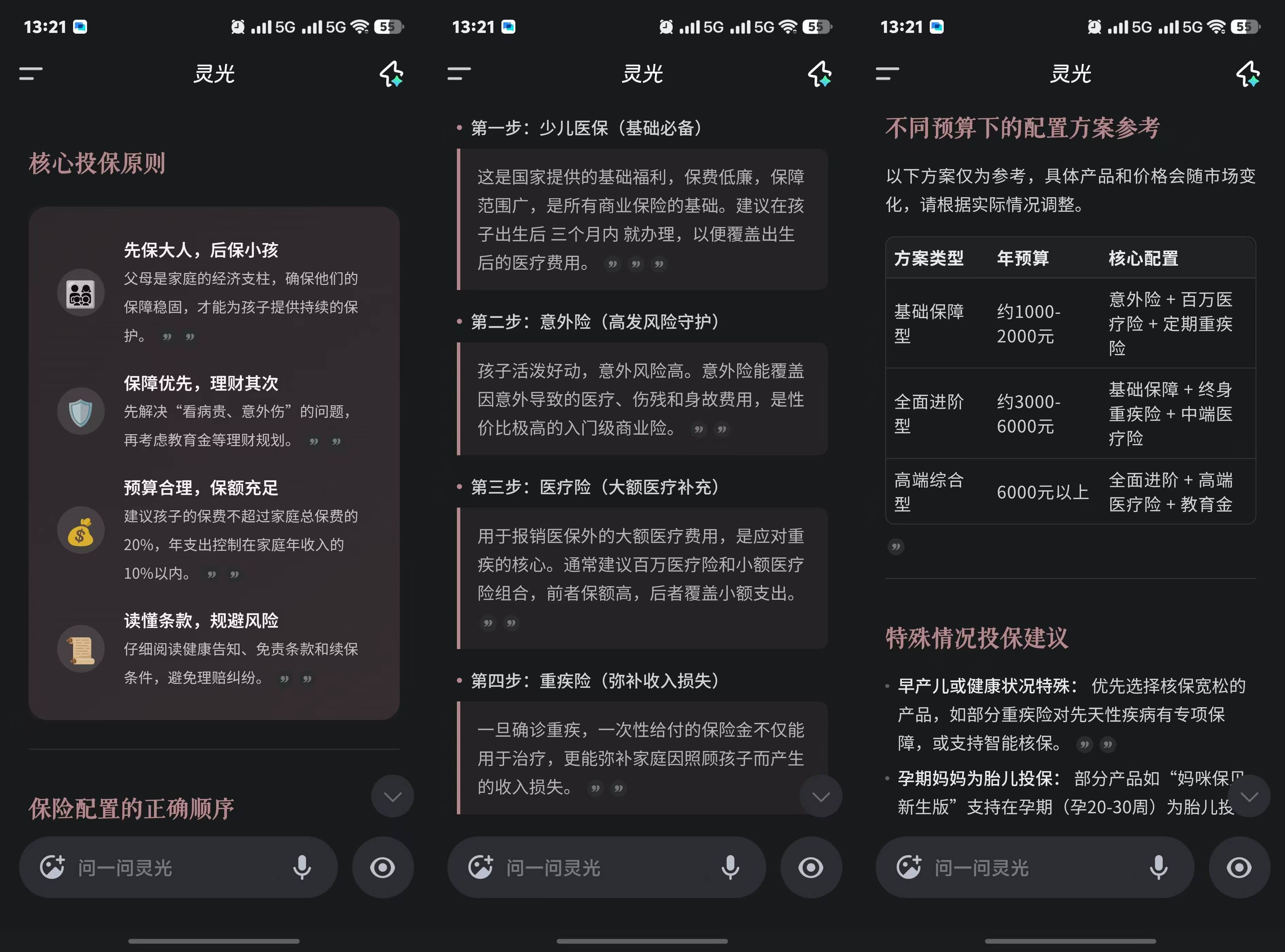 我问灵光「如何给孩子选保险」,得到的回应远不如那些佯装在思考的工具复杂。没有三千多字的保险科普、五个参考链接、三个推荐产品,也没有「是否需要我继续为你生成对比表单」的追问。