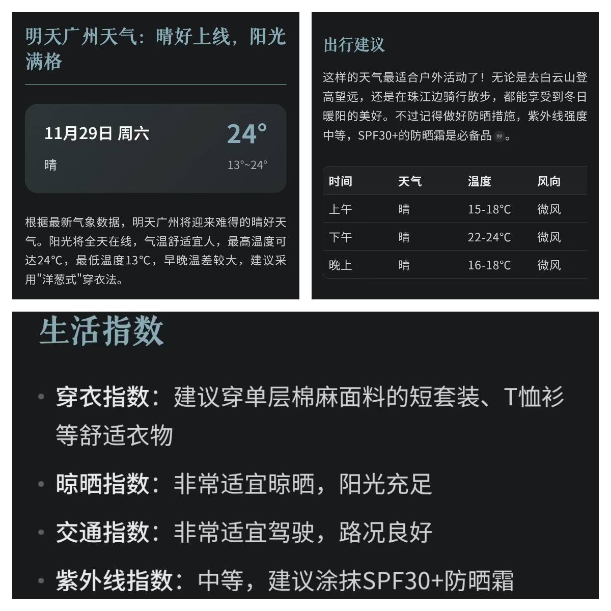 身边的老人用灵光查看广州天气,得到的不会只是天气数据的罗列,而有可能是一个气温变化图、一份穿衣建议、一份秋日出行指南——不仅易读,而且有用。
