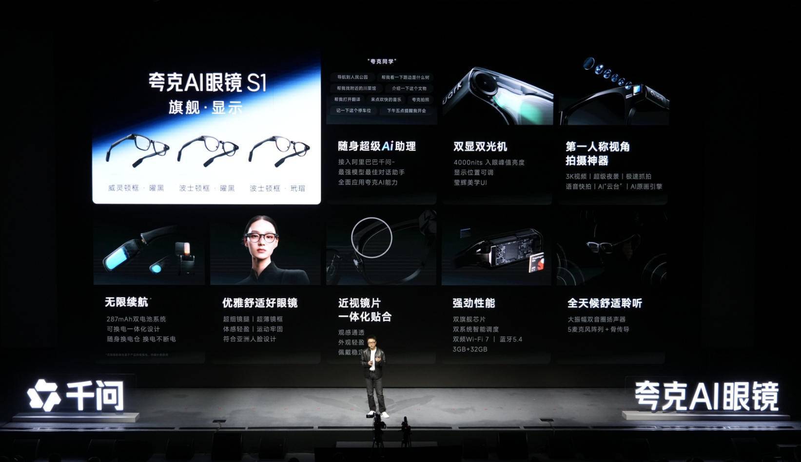夸克 AI 眼镜 S1 的硬件规格是这样的:高通骁龙 AR1 加恒玄 BES2800 双芯片方案,双光机双目显示,国内首创合像距可调,亮度可达 4000nits,二维衍射波导方案及高折射率镜片加镀膜工艺,五个麦克风阵列加骨传导;0.6 秒极速抓拍,Super Raw 暗光增强技术,3K 视频录制,超分超帧后可输出 4K 视频;定制研发小型化扬声器,镜腿仅 7.5 毫米宽。