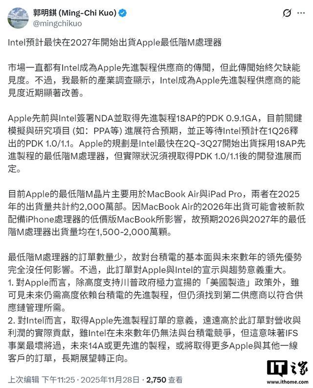 IT之家 11 月 28 日消息,分析师郭明錤今日爆料称,英特尔预计最快 2027 年开始出货苹果 M 系列中最低端的处理器。