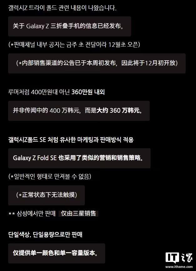 IT之家 11 月 29 日消息,消息源 yeux1122 昨日(11 月 28 日)发布博文,透露三星已于本周在内部销售渠道发布公告,有望于 12 月初正式推出其首款三折叠手机,售价预估为 360 万韩元(IT之家注:现汇率约合 17410 元人民币),仅有 1 种颜色、容量规格配置。