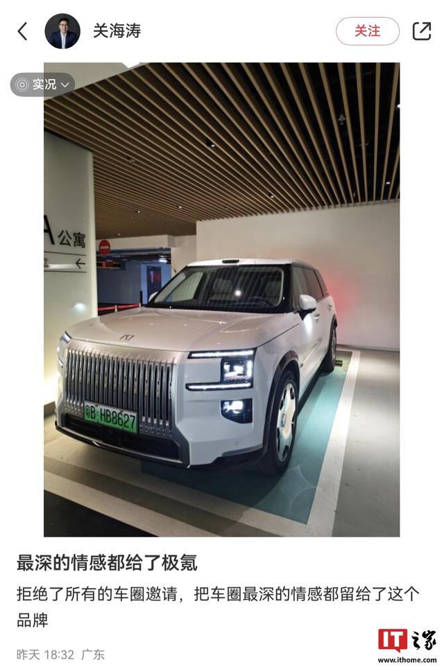 IT之家 11 月 30 日消息,前极氪智能科技 CBO CMO 关海涛昨日发布动态,称拒绝了所有的车圈邀请,把车圈最深的情感都留给了极氪品牌。