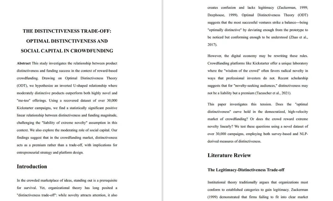 它提出了一个能与现有文献对话的假设,设计合适的统计模型,跑完数据,生成结果,再把整套内容写成了一篇14页的完整论文,包含摘要、理论、方法、数据描述、回归表格、讨论与局限。