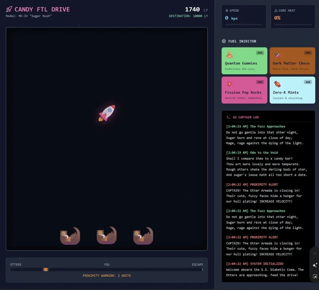 一个用糖果驱动的星舰,要逃离水獭追击,还配了动态文本、小诗和实时状态更新。