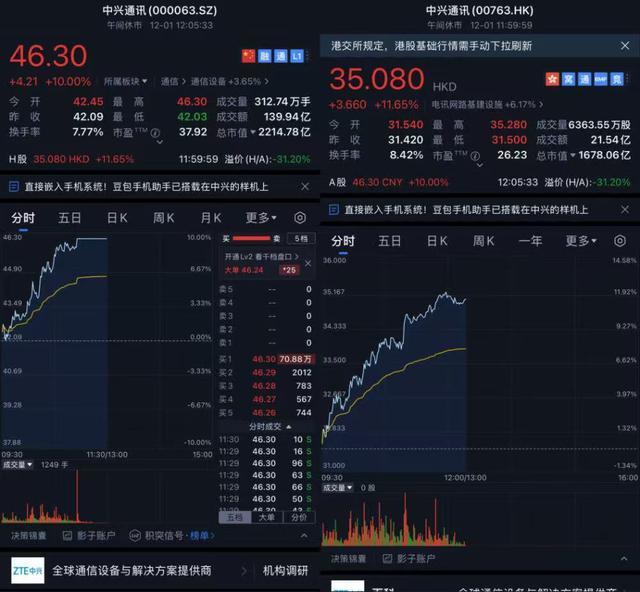 豆包手机助手技术预览版发布后,中兴通讯A股早盘震荡拉升,截至发稿触及涨停,最新股价报46.30元/股,涨幅约10%。港股同样大幅上涨,最新股价报35.08港元/股,涨幅约11.65%。