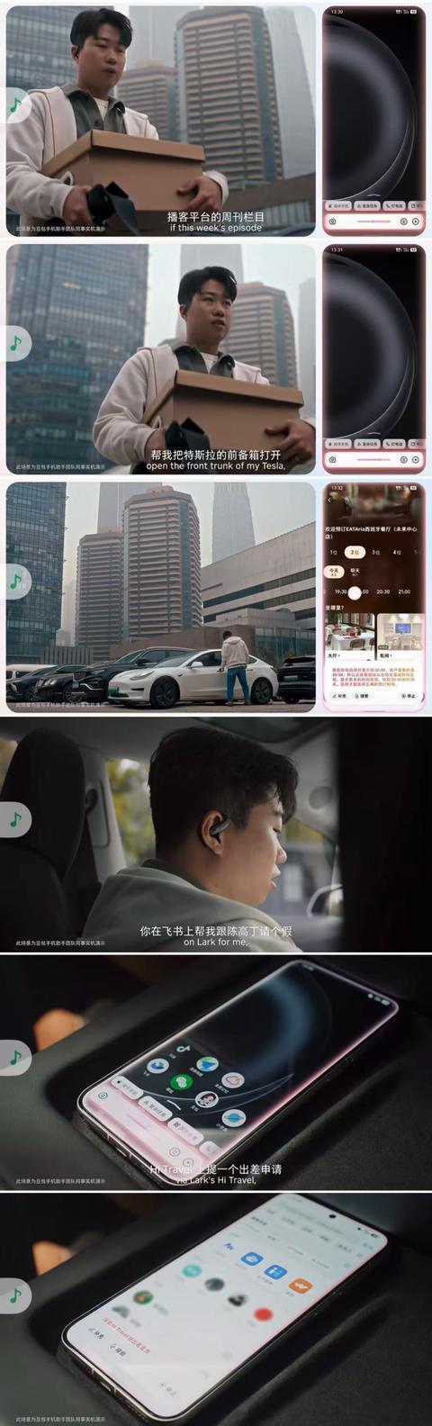在另一个场景中,豆包手机助手在用户仅以自然语言描述需求的情况下,自动查询播客更新并加入播放列表,同时远程打开汽车前备箱、预订餐厅、在飞书上提交请假申请和差旅报备、预订周一早班高铁车票。
