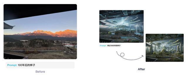 除了变换视角,Emu3.5还可以“预测”图片场景100年后的样子: