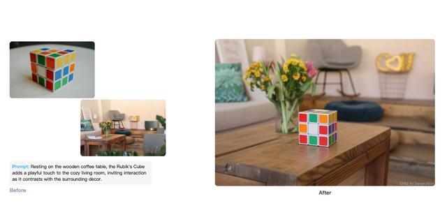 在画面中加入一个物体也不在话下,Emu3.5可以直接将魔方放置在图片场景中,并且会根据场景的光线和风格自动调整物体的色调,不会出现“不在一个图层”的效果。