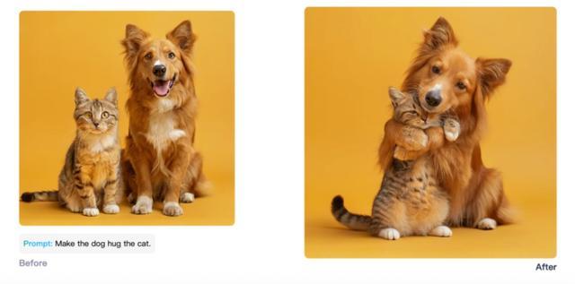 此外,Emu3.5还可以更改画面中主体的位置关系和动作形态,比如让小狗拥抱小猫:
