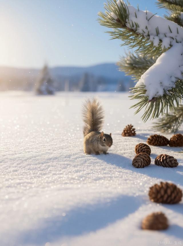 原图片中,小松鼠和背景色调一致,肉眼都容易看不清楚,Emu3.5却十分精准地识别出了小松鼠的形象。其生成的图片光影、结构准确,连阳光照射在雪地上的反光都十分逼真,在画面的前方和后方背景,还实现了相机般的虚化效果。