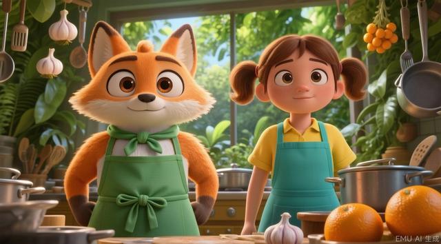 在一个充满活力的厨房场景中,大窗户外可见郁郁葱葱的绿植。两个动画角色并排站着。左边是一个拟人化的狐狸模样的生物,有着橙色的皮毛、白色的腹部和一双富有表现力的大眼睛,脖子上系着一条绿色的围裙。右边是一个年轻女孩,棕色的头发扎成了辫子,穿着黄色的衬衫,外面套着一件蓝绿色的围裙。两个角色似乎都在忙着做饭,背景中挂着各种厨房用具、锅以及橙子、大蒜等食材。整个环境明亮又欢快,阳光透过外面的树叶洒进来。图像中没有可见的文字。