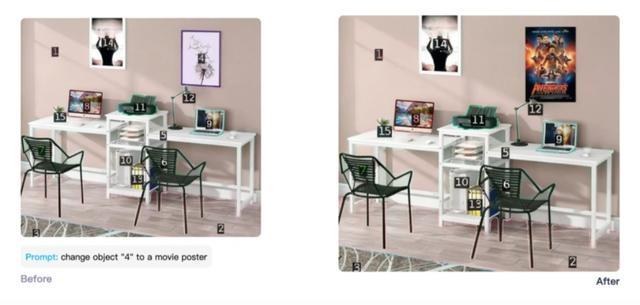 识别数字和计数一直是多模态模型的弱点,Emu3.5却可以精准识别将图片中的标号,将指定序号的挂画换成另外一张海报: