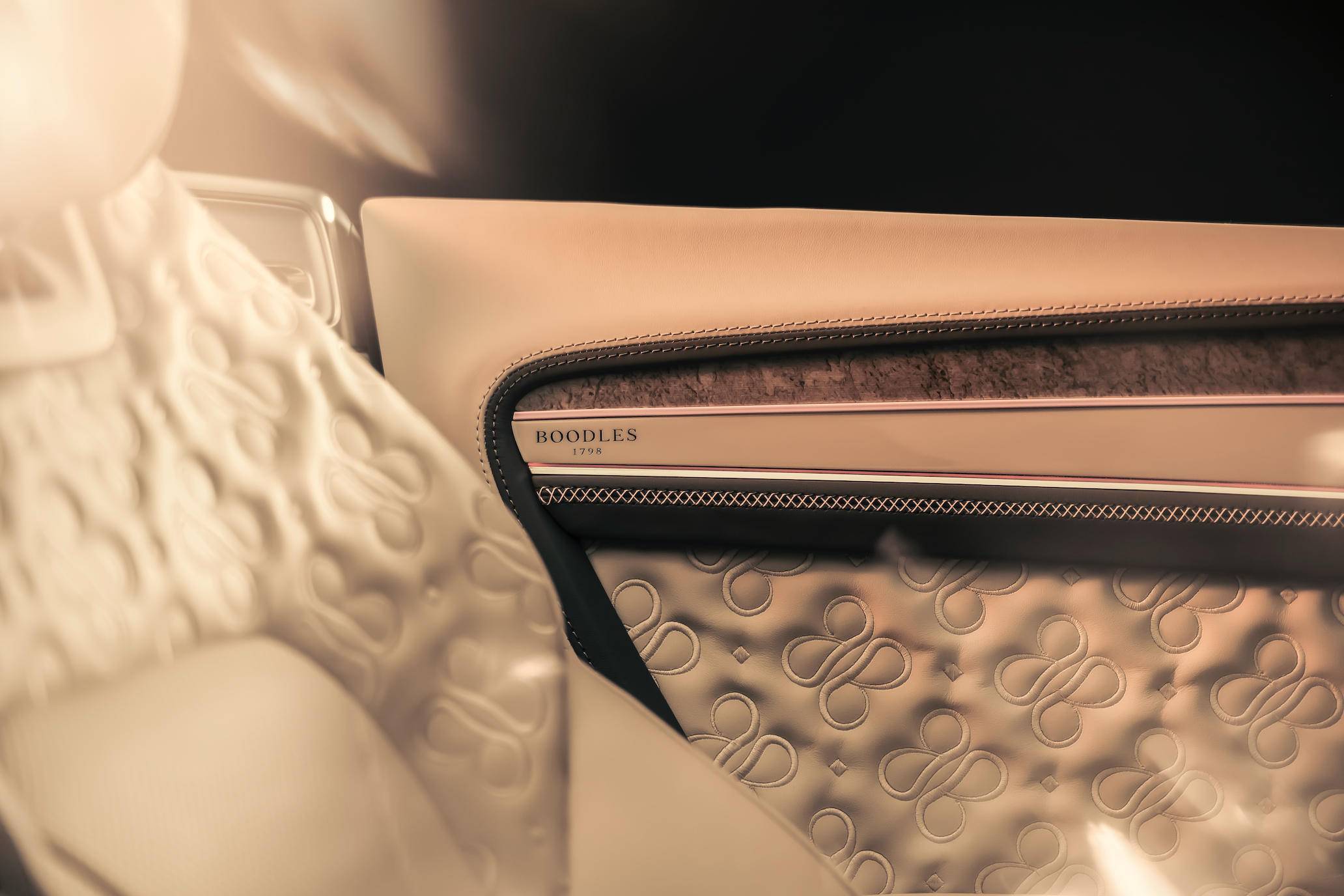 同样的逻辑也延伸到了石头上。在与珠宝品牌 Boodles 的合作中,Mulliner 用激光将形成于 2 亿年前的天然石材切削至仅有 0.1 毫米厚。听起来没什么,但要把一块石头加工成纸张的厚度,并让它完美贴合在曲面上,同时还要保证它在车辆震动中不碎裂,并不是一件容易的事。