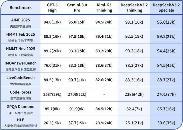 据DeepSeek公布的数据,Speciale在多个推理基准测试中超越谷歌最先进的Gemini3 Pro。具体来看,在美国数学邀请赛、哈佛MIT数学竞赛、国际奥林匹克数学竞赛等测试中,V3.2-Speciale都超过了Gemini3 Pro,但在编程、理工科博士生测试中略逊于谷歌。